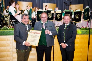 Nach der Pause holte der musikalische Gong, nämlich das Quartett „Weißblech“ das Publikum zurück ins Programm und läutete damit den traditionellen Teil mit dem „Maxglaner Zigeunermarsch“ und der „böhmischen Liebe“ ein. Dem ehemaligen Kapellmeister und langjährigen Musiker Franz Zopf, der sich im Vorjahr nach über 40 aktiven Jahren (davon 23 Jahre als Kapellmeister) in seine verdiente Musikerpension verabschiedet hat wurde zum Abschied der Titel des Ehrenkapellmeisters verliehen.