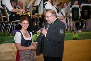 Iris Hamminger an der Querflöte und Wolfgang Langer am Tenorhorn zeigten bei „Grandfather’s Clock“ als Solisten ihr Können, nach „I will survive“ ergriff der Jugendreferent Georg Bruckschlögl das Wort. Sowohl Roland Panzl als auch Wolfgang Langer haben das Jungmusikerabzeichen in Bronze absolviert, Jakob Bruckschlögl in Silber. Mit den „Purple Drums“ folgte das zweite Solostück des abends, auch der junge Schlagzeuger Simon Gebhartl durfte sein Können zeigen. Bevor sich das Orchester mit den „Golden Hits“ von James Last verabschiedete wurde noch Michaela Schwaiger als Marketenderin in den Verein aufgenommen.
