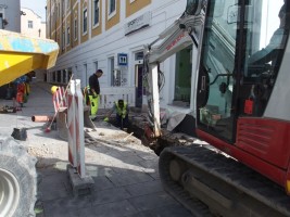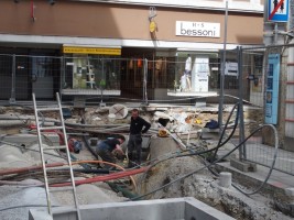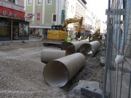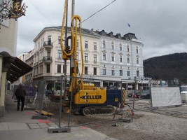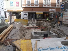 Am Rathausplatz konnten die Asphaltierungsarbeiten an der Leitungskünette abgeschlossen werden und die Asphaltfräse und andere Maschinen eroberten zusammen mit den fleißigen Helden inzwischen auch den Rest von Baufeld 3. Unter anderem wurde dort nun schon mit der Errichtung des ersten Mastfundaments begonnen und die Arbeiten der Untergrundverbesserung erreichten nun ebenso den Abschnitt Rathausplatz. (Randbemerkung für Autofahrer: Trotz Erweiterung des Baufelds ist der Rathausplatz während der gesamten Bauzeit befahr- und beparkbar! Die Kirchengasse ist für Liefer- und Anrainerverkehr ebenfalls vom Rathausplatz aus erreichbar.)