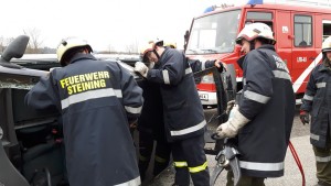 Zur jährlichen Gemeinschaftsübung am 23. März waren die Mitarbeiter der Firma Zaunrith geladen, welche im Alarmfall mit der FF Steining ausrücken. Nach dem Erkunden der Gerätschaften, wurde mit dem hydraulischen Rettungsgerät an zwei PKW`s verschiedenste Schnitt- und Bergetechniken beübt.