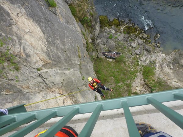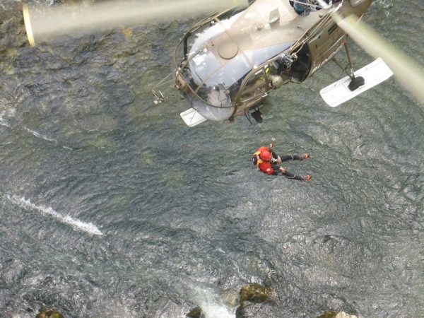 Das Schlauchboot hängt an der Prallwand auf der linken Seite und eine Person wird dort immer wieder unter Wasser gedrückt. 2 weitere Personen konnten sich an das rechte Flussufer mit schweren Kopf/Wirbelsäulenverletzungen retten. Die Wildwasserretter begannen mit einer flächendeckenden Suche flußarbwärts vom Unfallort. Auf Grund der schwierigen Geländebedingungen wird für den An- und Abtransport des Materials und Suche nach dem vermissten Kind ein Hubschrauber des Bundesheeres angefordert. Mit der Alouette III wurden auch die schwer verletzten Personen mittels Seilwinde geborgen und dem Roten Kreuz übergeben.