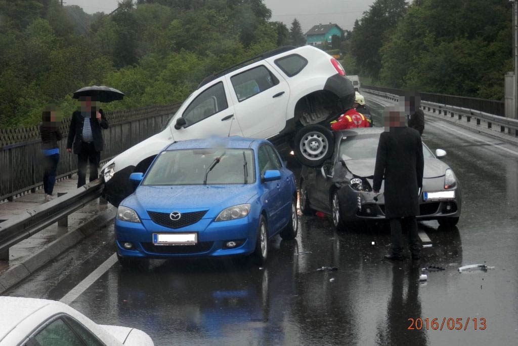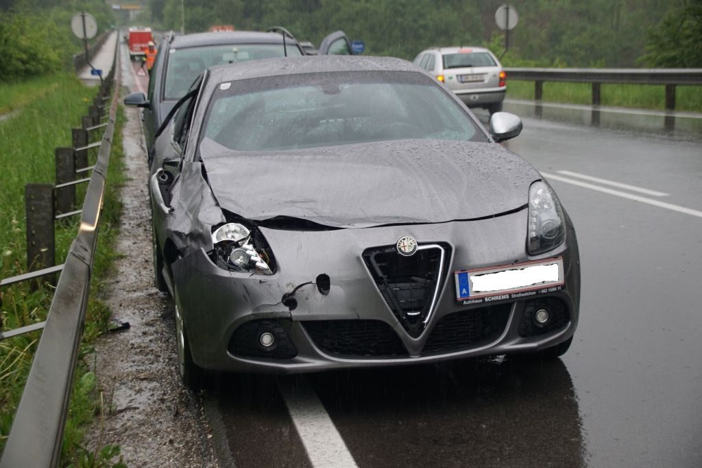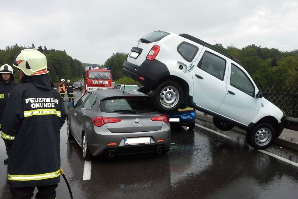 Der dahinter fahrende Lenker, ein 21-Jähriger aus Neukirchen, konnte seinen Pkw nicht mehr rechtzeitig anhalten und wollte nach links ausweichen. Da er noch rechtzeitig ein entgegenkommendes Fahrzeug bemerkte, verriss er das Auto wieder nach rechts und prallte gegen das Heck des 51-jährigen Gmundners. Dadurch wurde das Auto des 21-Jährigen wiederum beschleunigt und folglich in die Luft geschleudert. Der Pkw des 51-Jährigen drehte sich um die eigene Achse und kam in der Folge zwischen Autodach des 21-Jährigen und der Leitschiene zum Stehen.