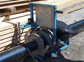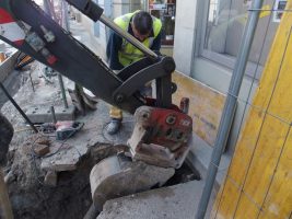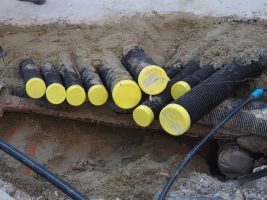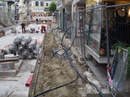 Zeitgleich wurden weitere Rohre verlegt, bereits verlegte Rohre neben der Grundplatte unter einer Sandschicht begraben, die neue Wasserleitung über den neuen Schacht ins Schutzrohr unter der Grundplatte eingezogen und es wird fleißig an den Hausanschlüssen der Gasleitung gearbeitet.