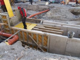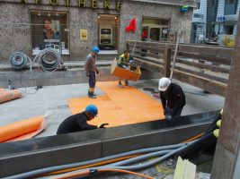 Auf einem großen Teil der Grundplatte wurden schon die Elastomermatten für das Masse-Feder-System (Erschütterungsschutz) verlegt und auch schon die Bewährung und der Schutzbeton aufgebracht, so dass – wenn alles weiterhin so gut geht, in der nächsten Woche dort auch schon die ersten Schienen verlegt werden können.