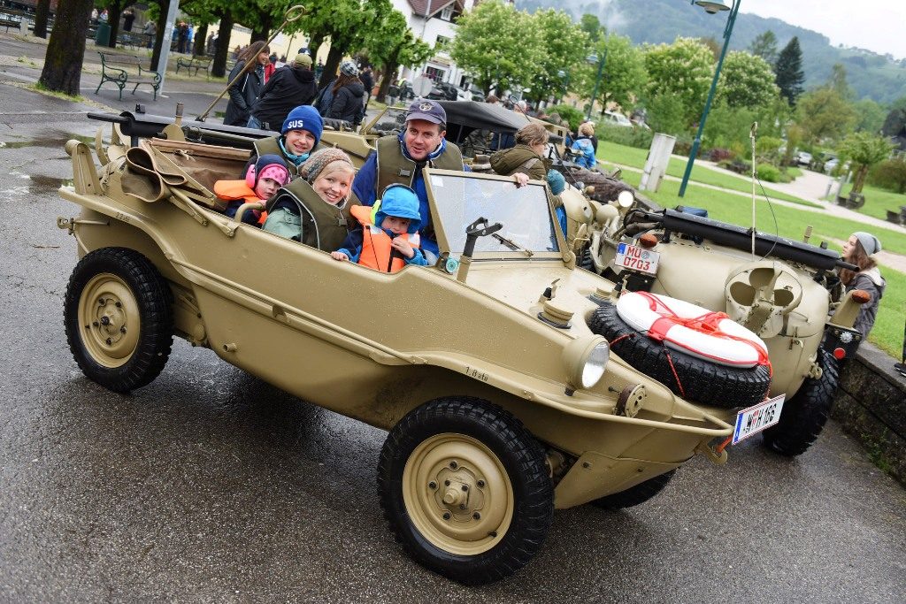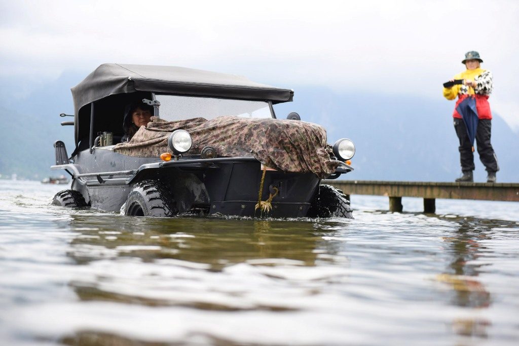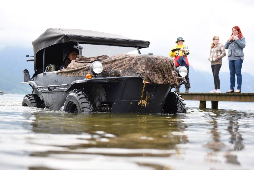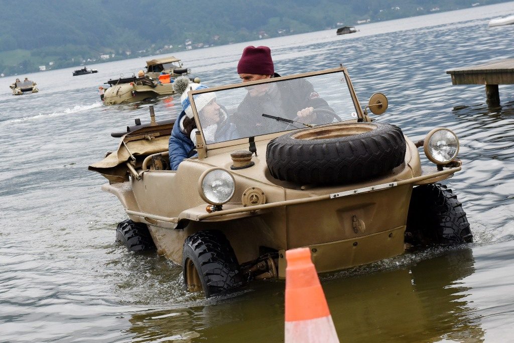 Wasserfest mussten die Teilnehmer und Autos des Schwimmwagen-Treffens in Altmünster dieses Wochenende sein: Nicht nur von unten, wenn sie durch den Traunsee schwammen, sondern auch von oben, weil es zeitweise wie aus Kübeln goss.