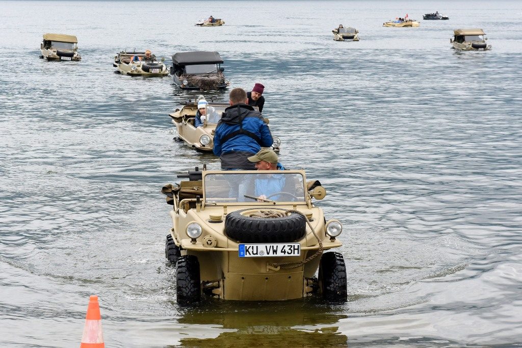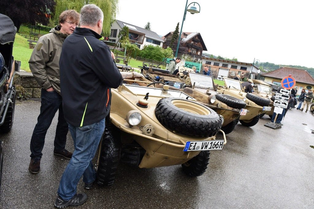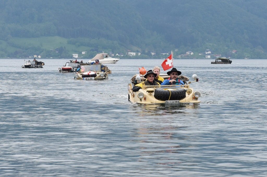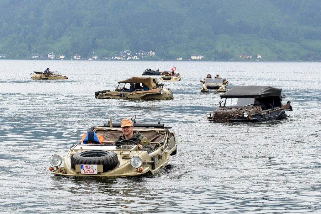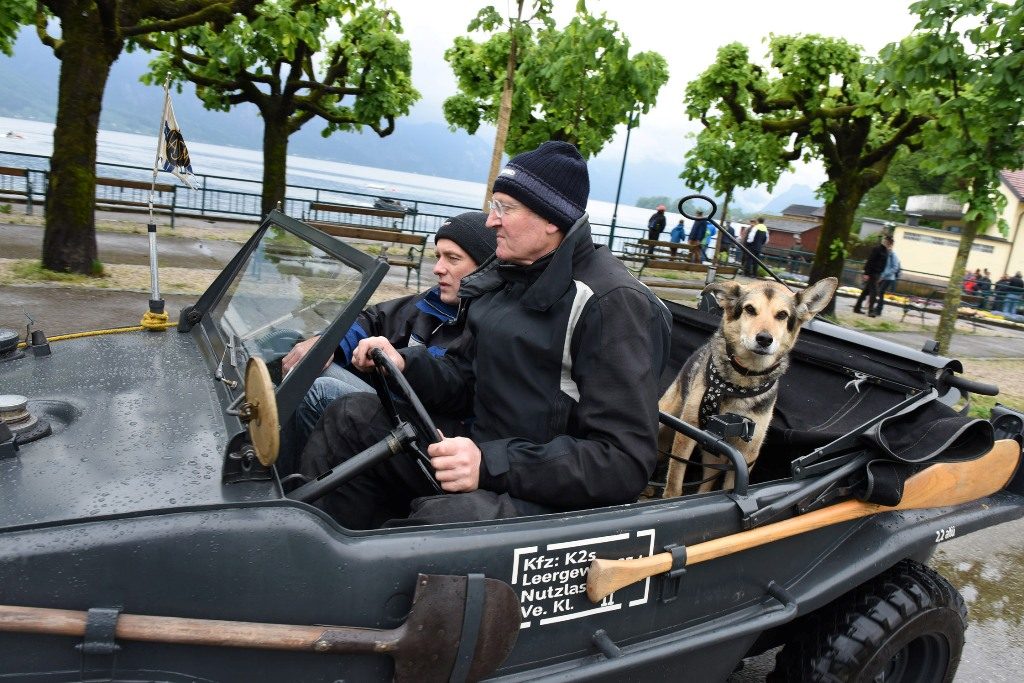 Wasserfest mussten die Teilnehmer und Autos des Schwimmwagen-Treffens in Altmünster dieses Wochenende sein: Nicht nur von unten, wenn sie durch den Traunsee schwammen, sondern auch von oben, weil es zeitweise wie aus Kübeln goss.