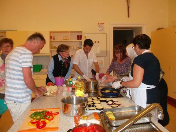 Am 13. April und am 10. Mai ging es hoch her in der Küche der Johann Nestroy Schule. An beiden Terminen wurden 50 Männer und Frauen aus Syrien und Österreich von zwei syrischen Familien beim Kochen angeleitet. Rosgar und Arifa Suleiman sowie Shadi und Shirin Alostah zauberten mit ihren Gästen ein dreigängiges Menü. Neben den brodelnden Töpfen blieb genug Zeit zum Reden, Diskutieren und zum Kennenlernen einer vorerst fremden Kultur.