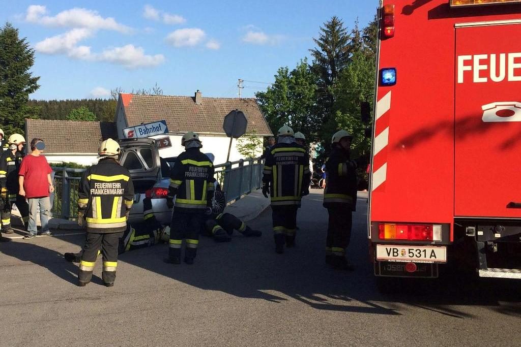 Am 20.05.2016 um 18:09h wurde die Feuerwehr Frankenmarkt zu einem Verkehrsunfall auf der sogenannten Kernbrücke alarmiert. Ein Lenker war mit seinem Cabrio gegen das Brückengeländer gestoßen, so dass die Front des Fahrzeugs über die Vöckla ragte. Es bestand jedoch keine unmittelbare Absturzgefahr.