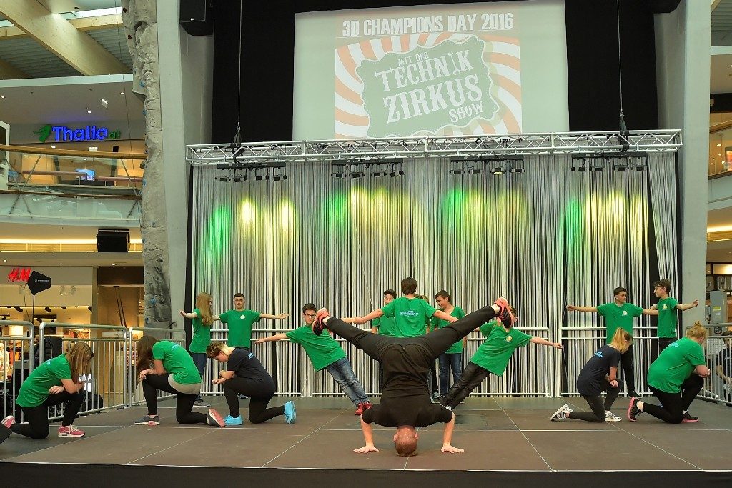 Für den diesjährigen 3D Champions Day entwickelten die Firmen seele, MIBA, RORA Aviation Systems und abatec gemeinsam mit Schulen das neue spielerische Schnupper- und Experimentierangebot „Technik Zirkus“. An den speziell entwickelten Berufsorientierungs-Mitmach-Stationen nahmen mehr als 350 Schüler teil. Zusätzlich entwickelten Schüler, Lehrer gemeinsam mit den Firmen und Profi-Artisten spezielle Show Acts, in denen technische Inhalte mit Zirkus-Artistik dargestellt wurden. Schüler der NMS Vorchdorf, NMS Gmunden, NMS Laakirchen und NMS Schörfling zeigten mit den Jonglier-Doppelweltmeistern Jonglissimo, Break-Dance Weltmeister Bboy Bench und dem Weltcup-Klippenspringer Alain Kohl am 3D Champions Day eindrucksvolle Show Acts und begeisterten die Anwesenden.