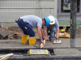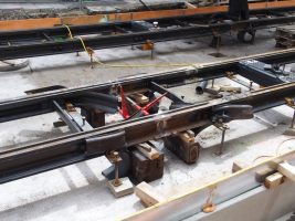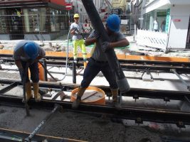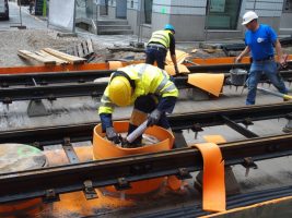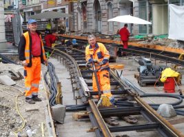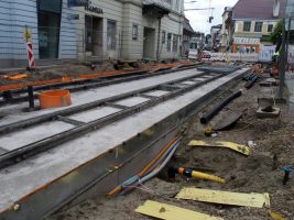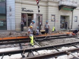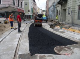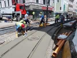 Auch unsere Schweißer waren wieder fleißig zugange und im Baufeld 1 konnte nun auch schon die Füllbetonschicht zwischen Schienen und Gleisen eingebracht werden. Das Anschlussstück an den vorigen Bauabschnitt an der Grabenkreuzung (wo sich die Gleistragplatte teilt) wurde bereits grob asphaltiert, was momentan vor allem die bessere Zufahrt für die Baufahrzeuge ermöglicht und zugleich auch die Phase der Oberflächengestaltung ankündigt.