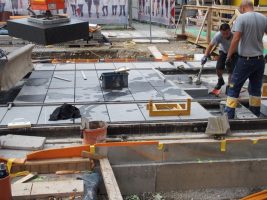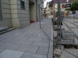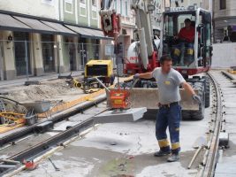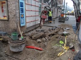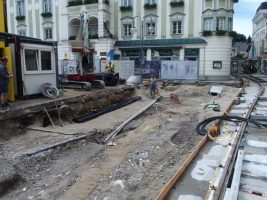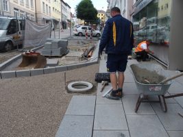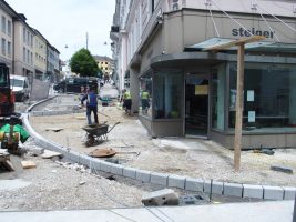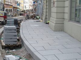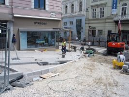 Die Pflasterer legen sich so richtig ins Zeug und zeigen, was sie können: Vom Graben bis zur Kursaalgasse lädt der schöne breite Gehsteig bereits jetzt zum Flanieren ein! Auch auf der gegenüberliegenden Seite sind schon die Randleisten gesetzt, so dass die Arbeiten auch hier gleich fortgesetzt werden können. Im Bereich der Grabenkreuzung, neben dem Baubüro liegen ebenfalls schon etliche Quadratmeter Granit und sogar am Rathausplatz ist schon ein gutes Stück gepflastert. Tolle Leistung!