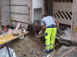 Währenddessen erledigen die verschiedenen Leitungsträger noch die Arbeiten an den jeweiligen Hausanschlüssen, die letzten Rohre und Schläuche werden noch verlegt und auch das Kabelziehen hat begonnen.