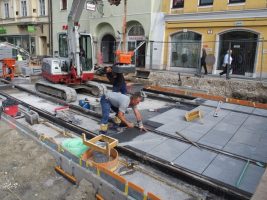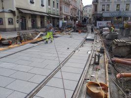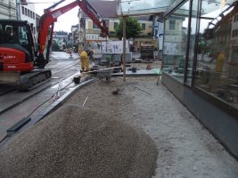 Auch in KW 25 wurde gepflastert, gepflastert, gepflastert und die Fortschritte können sich sehen lassen. Am Rathausplatz wurden übrigens auch schon die ersten Leistensteine für den zukünftigen Bahnsteig gesetzt.