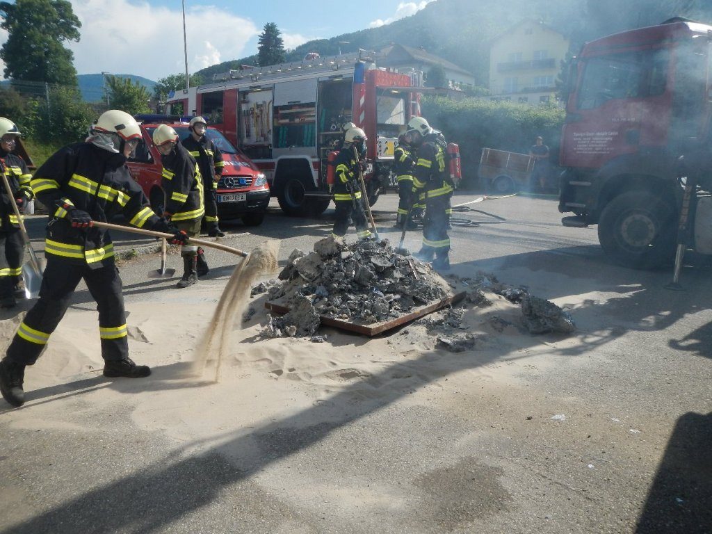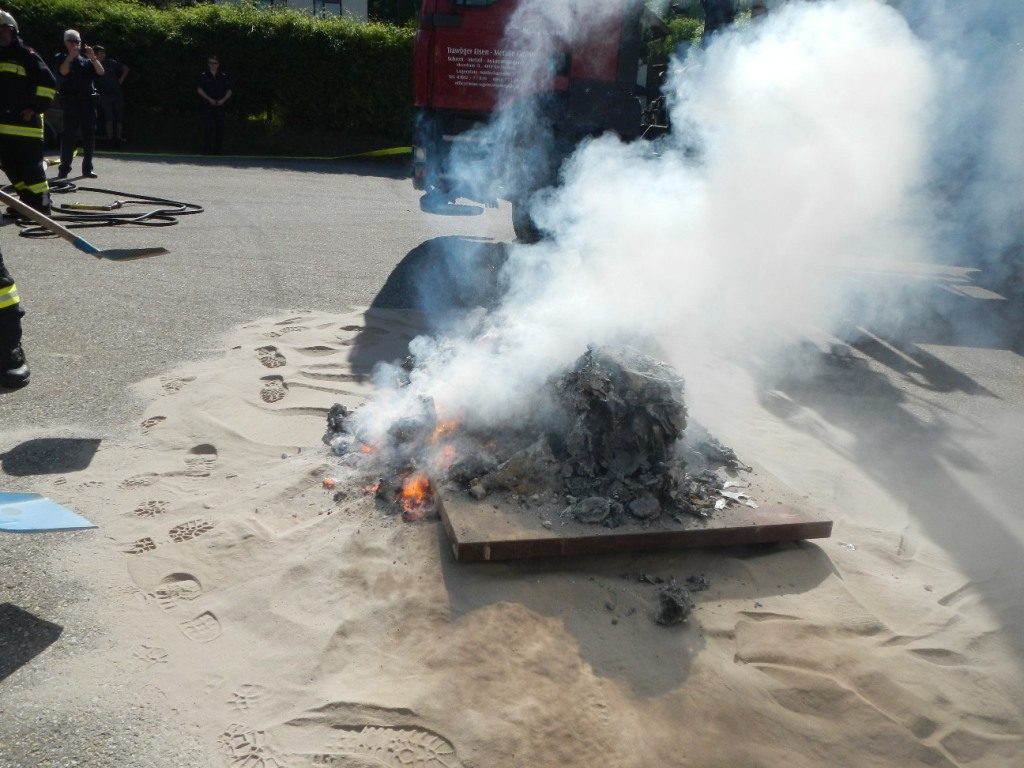 In weiterer Folge wurde ein LKW einer Privatfirma angefordert, um den Container aus der Halle zu ziehen und die brennenden Metallreste auf einem vorbereiteten Sandbett zu verteilen. Die Brandreste wurden mit Sand abgedeckt. Nach Kontrolle mittels Wärmebildkamera konnte „Brand aus“ gegeben werden. Am späteren Abend wird mittels Wärmebildkamera noch einmal Kontrolliert.
