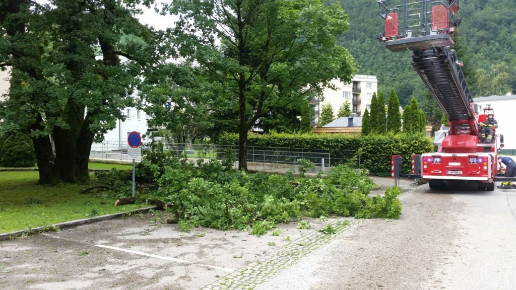 Gleich darauf wurden die Kameraden zu einem technischen Einsatz alarmiert. Ein Ast drohte im Bereich der Rettenbachwaldstraße auf die Straße bzw. auf einen Parkplatz zu stürzen. Die Kameraden der FF Bad Ischl rückten mit der Drehleiter an, und entfernten den Ast.