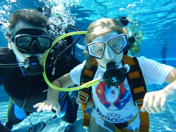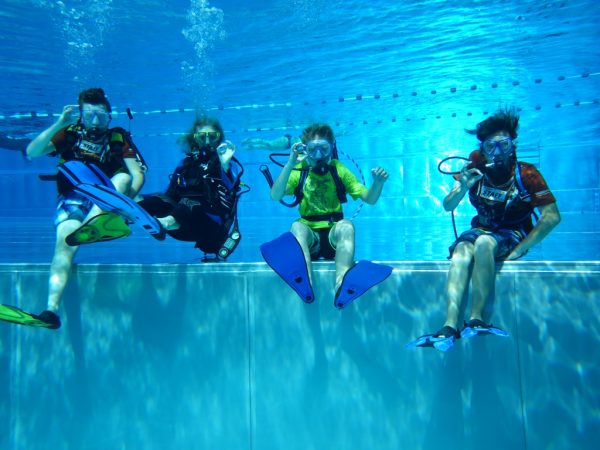Ausgestattet mit kleinen Pressluftflaschen, Masken und Flossen erforschten die Kinder die Unterwasserwelt. Reifen wurden durchtaucht und das Unterwasserversteck, gefüllt mit Süßigkeiten wurde geplündert. Die 30 Wasserratten konnten gar nicht genug bekommen und drehten eine Runde nach der anderen.