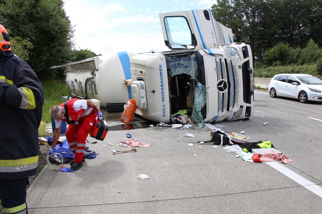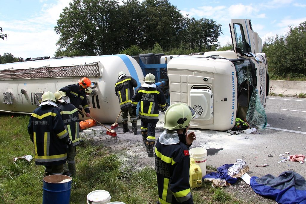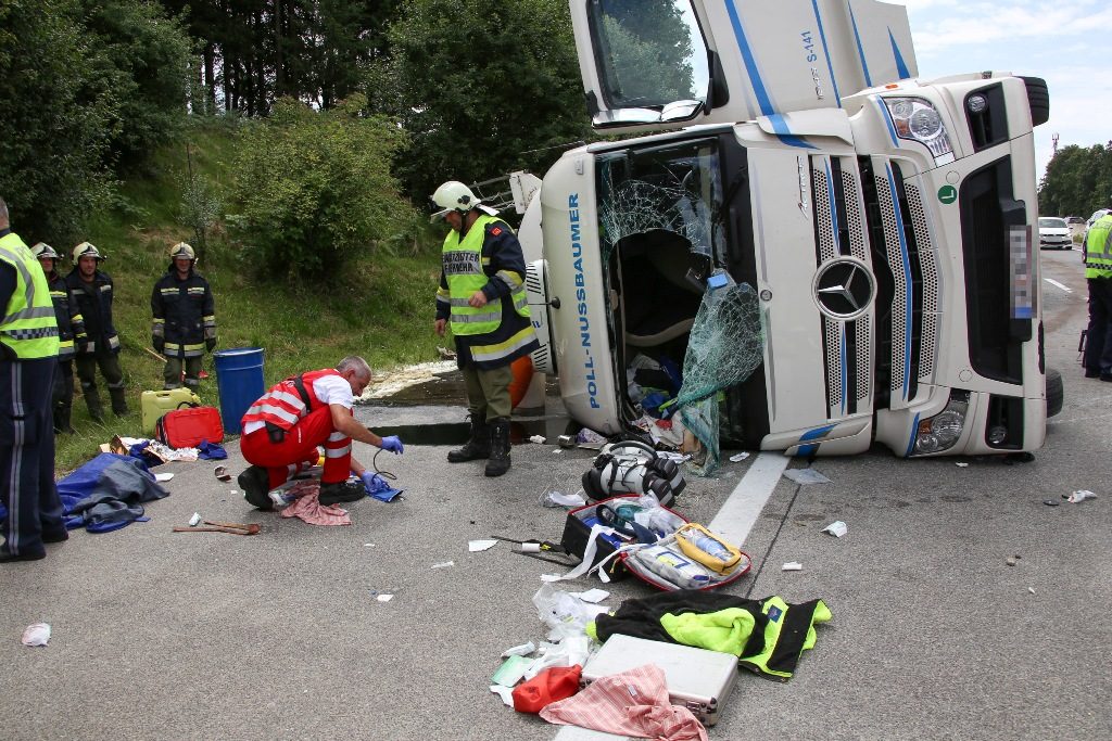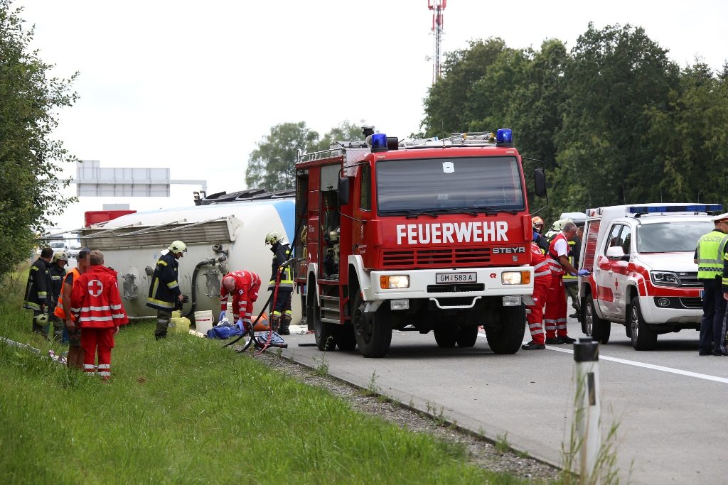 Aus bisher unbekannter Ursache kam ein LKW-Lenker mit seinem Schwerfahrzeug von der Fahrbahn ab. Der LKW, der etwa 25 Tonnen Zement geladen hat, stürzte daraufhin um. Der LKW-Lenker erlitt bei dem Unfall schwere Verletzungen. Er musste nach der Erstversorgung durch Rettungsdienst und Notarzt mit dem ÖAMTC Rettungshubschrauber Christophorus 10 ins Krankenhaus geflogen werden. Ein Spezialbergeunternehmen wurde zur Fahrzeugbergung angefordert.