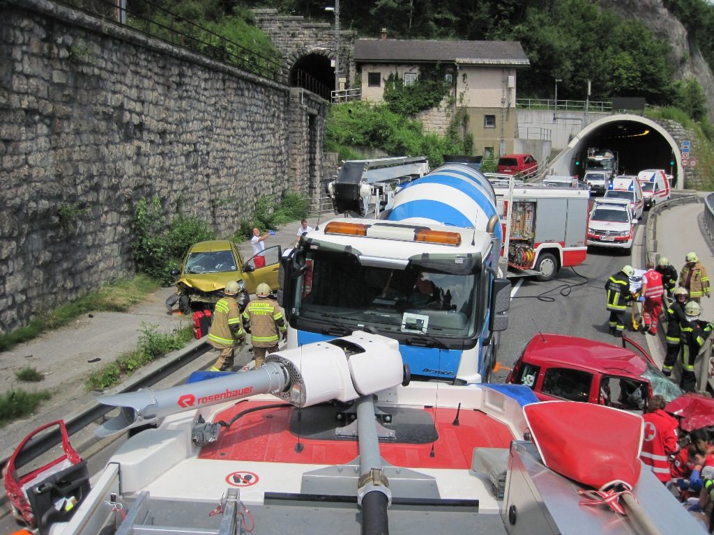 Aus unbekannter Ursache prallte ein aus dem Bartlkreuztunnel kommender PKW frontal in den Gegenverkehr. Ein Insasse musste mittels hydraulischem Bergegerät aus dem Auto geschnitten werden. Zwei schwer verletzte Personen mussten mittels Notarzthubschraubern und die leicht verletzten Personen mittels Krankenwagen abtransportiert werden. Die B145 war für ca. 2 Stunden für den Verkehr gesperrt.