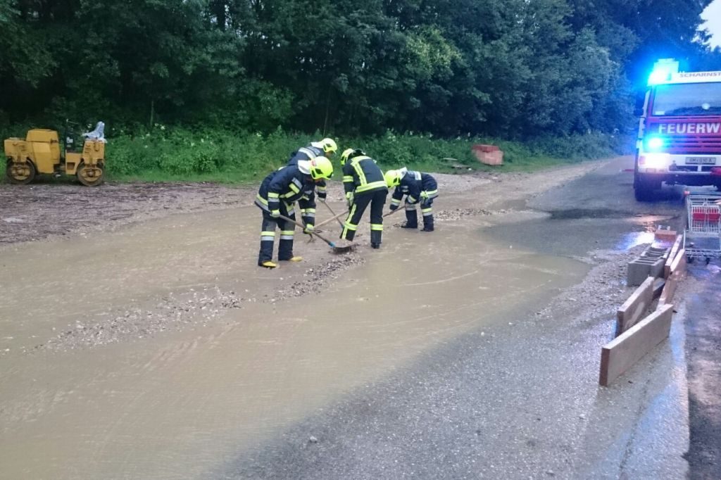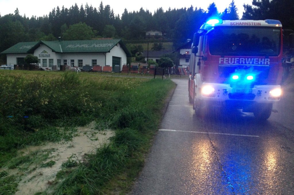 Am Dienstagabend, 12.07.2016 wurde die Feuerwehr Scharnstein um 19.36 Uhr von der Landeswarnzentrale zu einer Überflutung im Bereich B120, Rathberg 1 alarmiert. Ein Wasserdurchlass durch die Bundesstraße konnte die ankommende Wassermenge nicht mehr aufnehmen bzw. bildeten sich Verklausungen. Die Feuerwehr konnte in diesem Bereich die Gefahr rasch bannen und musste in Folge des Unwetters noch in der Nähe bei einem Trachten und Jagdbekleidungshändler bei Reinigungsarbeiten im Keller helfen. Hier schaffte eine installierte Abwasserrinne die Ableitung der ankommenden Wassermenge nicht mehr und trat in den Keller ein. Mit Gummischieber und Aufbau eines kleinen Dammes konnte auch hier rasch Abhilfe geschafft werden.