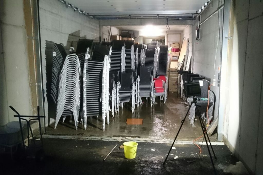 Die Kameraden der Feuerwache Perneck mussten, bevor sie ausrücken konnten, ihr eigenes Depot von den Wassermassen, welche entlang der Perneckerstraße flossen, schützen. Erst dann konnten sie selbst in Not geratene Personen helfen.