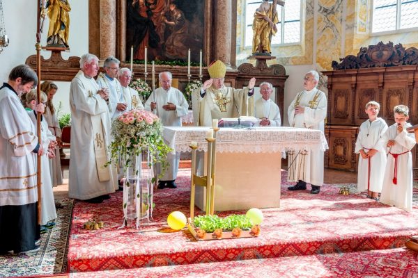 Natürlich wurde beim anschließenden Frühschoppen der Marktmusik Timelkam im Klosterhof noch bis in den Nachmittag weitergefeiert, wobei sich als besonderer Gratulant  auch noch Altbischof Ludwig Schwarz, SDB., einstellte.