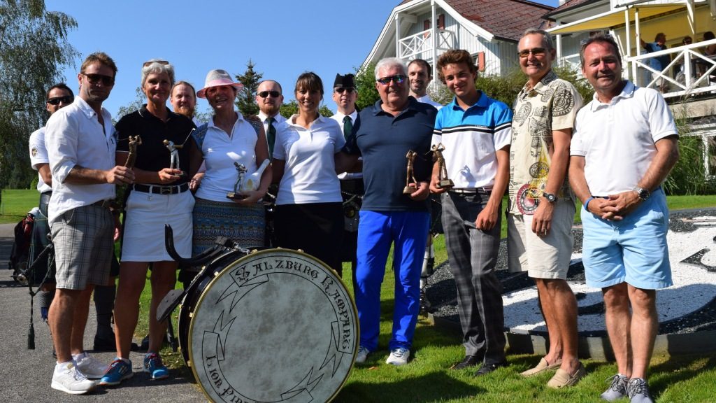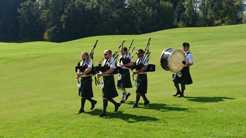 Es war ein sensationelles Erlebnis beim Finish des letzten Flights am 28.8. Die um das letzte Loch vor dem Clubhaus versammelten Turnierteilnehmer samt Anhang verfolgen mit Spannung die Schläge der um den Meistertitel wetteifernden Kontrahenten. Plötzlich erschien eine 5-köpfige schottische Band in Kilts und marschierte, mit drum und bagpipes laut aufspielend, den Fairway entlang. Erhebende Gefühle, Rührung und Begeisterung brausten auf, Schottland als Urmutter des Golfspiels ist da, die Clubmeisterschaft und ihre Golf-Gladiatoren wurden gebührend gefeiert, kurz: es war eine unglaubliche Stimmung an diesem Sonntagnachmittag auf Loch 18! Einzig die Temperatur bei 28 Grad war nicht besonders schottisch.
