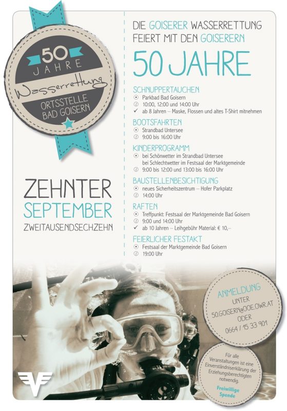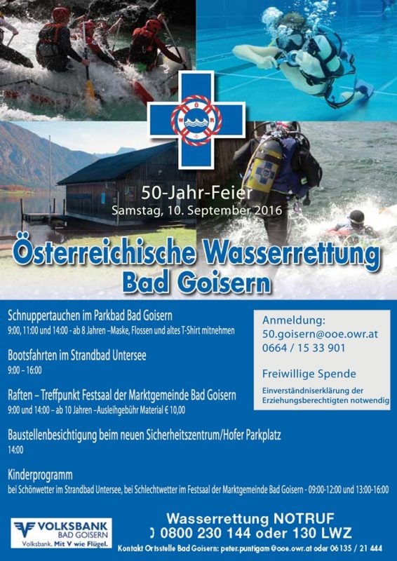Natürlich wird das 50 jährige Bestehen der Ortsstelle Bad Goisern gebührend gefeiert. Unter dem Motto „Goiserer Wasserrettung feiert mit den Goiserern“ wird am 10. September 2016 ein Aktionstag abgehalten.