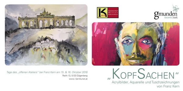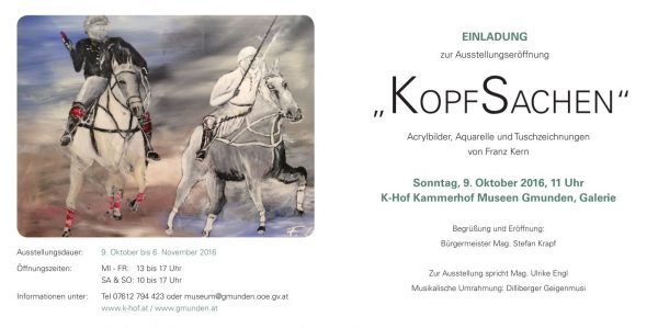 Ab 9. Oktober 2016 findet in den Kammerhof Museen Gmunden, Kammerhofgalerie, die Ausstellung „Kopfsachen“ von Franz Kern statt.