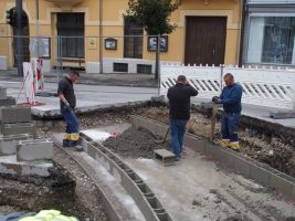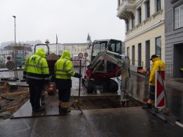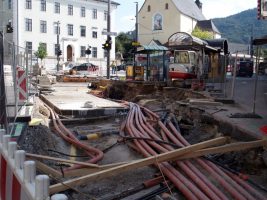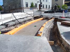 Auch im Baubereich Klosterplatz/Georgstraße geht es nun sichtbar voran: Mittlerweile konnte dort die Grundplatte für beide Gleisbögen betoniert werden und auch der Leitungsstrang der Telekom wurde weiter freigelegt.