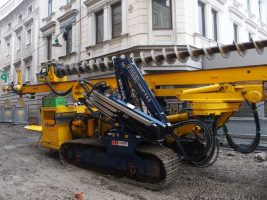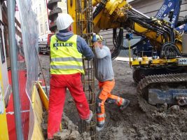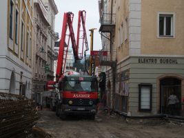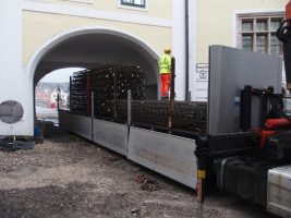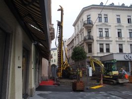In der Kammerhofgasse war die Gebäudesicherung mittels SOB-Pfählen (SOB = SchneckenOrtBeton) bereits in vollem Gange. Ein beeindruckendes Bohrgerät, der LKW mit der Betonpumpe und die Bewehrungskörbe machten sich den Platz in der engen Gasse streitig. Bislang hat alles gut funktioniert und die Arbeiten gingen schnell und gut voran.