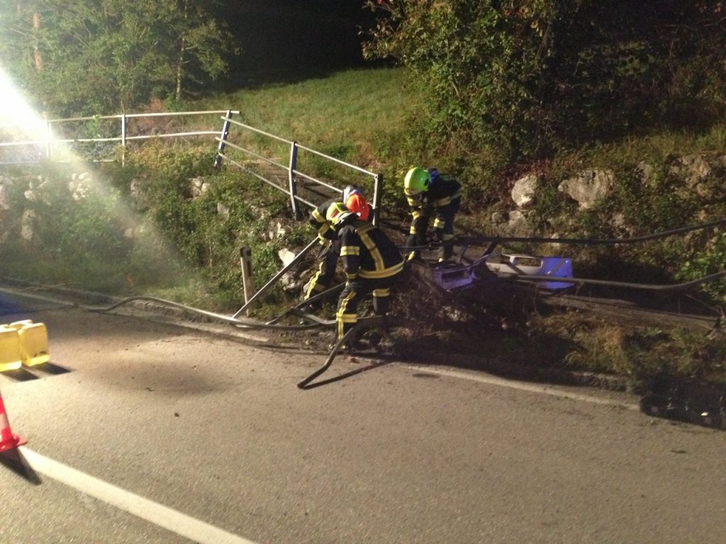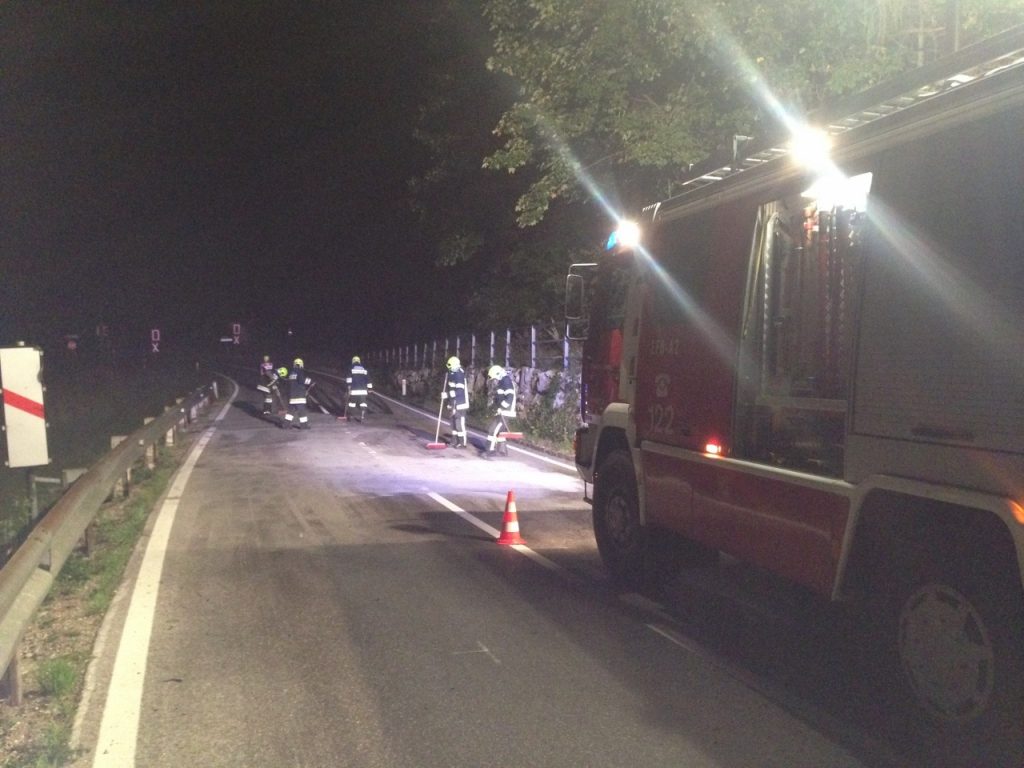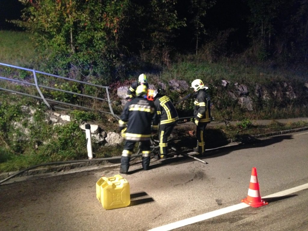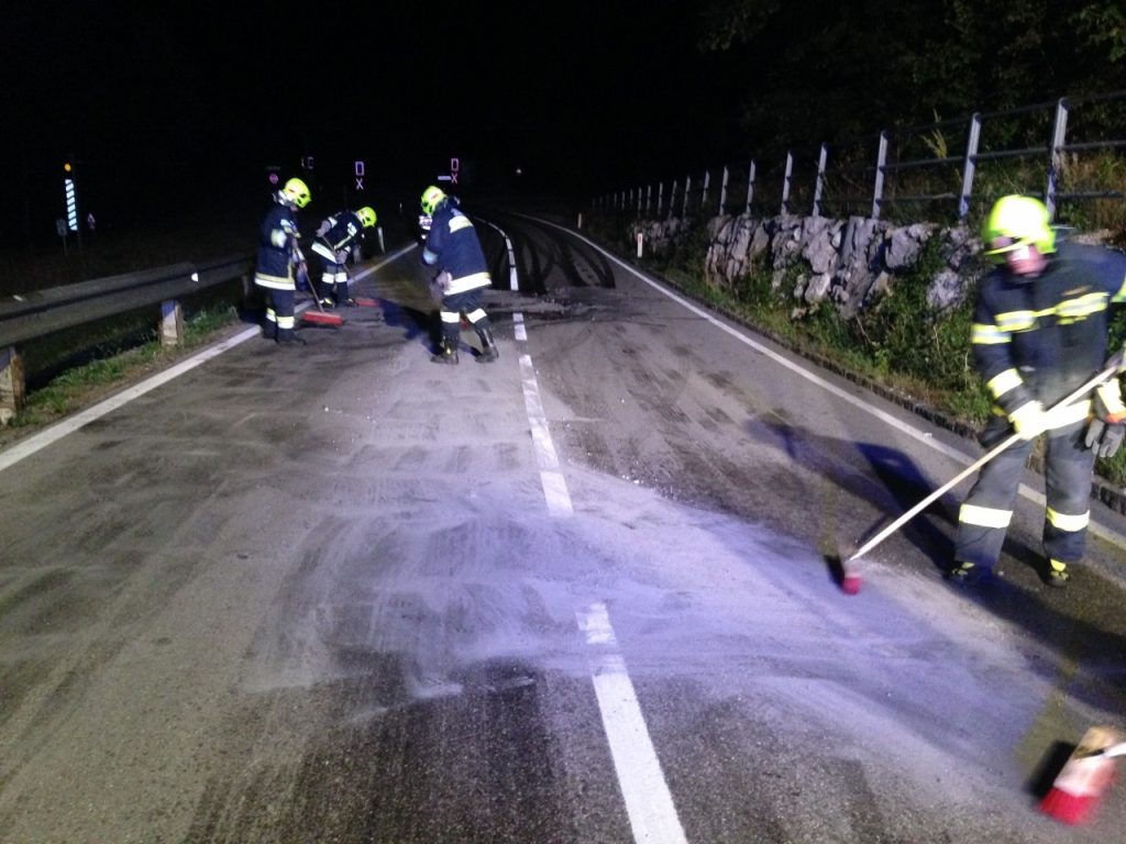 In der Nacht von Mittwoch auf Donnerstag, 22.09.2016 wurde die Feuerwehr Scharnstein gegen 1 Uhr zu einem Ölaustritt auf die L549 Almseestraße im Bereich Kothmühle alarmiert. Ein Richtung Grünau im Almtal fahrender PKW Lenker prallte aus unbekannter Ursache mit seinem Fahrzeug gegen ein Geländer und beschädigte dadurch sein Fahrzeug beträchtlich. Die Folge war ein massiver Ölaustritt auf der Almseelandesstraße in beiden Fahrtrichtungen.
