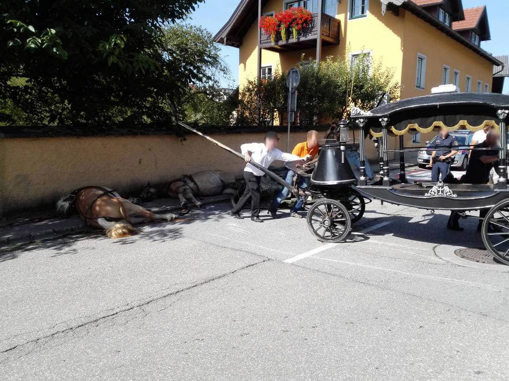 Am 12. September 2016 gegen 11:10 Uhr spannte ein 48-Jähriger in Mondsee seine beiden Haflinger-Pferde, sieben und zwölf Jahre alt, vor ein Fuhrwerk, um im Anschluss bei einer Beerdigung in Mondsee den Sarg zu transportieren. Mit einem zufällig vorbeikommenden Bekannten unterhielt sich der 48-Jährige kurz. Irgendetwas dürfte die beiden Pferde erschreckt haben und sie gingen durch.
