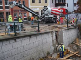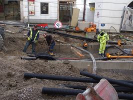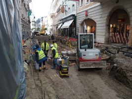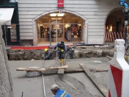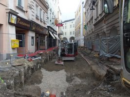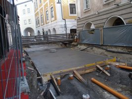In der Kammerhofgasse wurden emsig wie eh und je neue Rohre verlegt, ein weiterer Wasserleitungsschacht (gegenüber BIPA) gesetzt, die Baugrube weiter ausgehoben und auch dort wurde schon der erste Teil der Grundplatte betoniert. Pünktlich zum Wochenende konnte nun auch eine Brücke zwischen Schleissgasse und Haas Hüte/Huber Shop errichtet werden, was nicht nur die Shoppingausflüge dort wieder bequemer gestaltet, sondern allen Schaulustigen – so wie bereits im letzten Bauabschnitt – bestimmt wieder eine willkommene Tribüne darstellen wird.