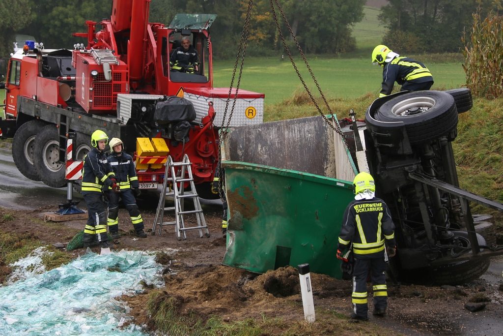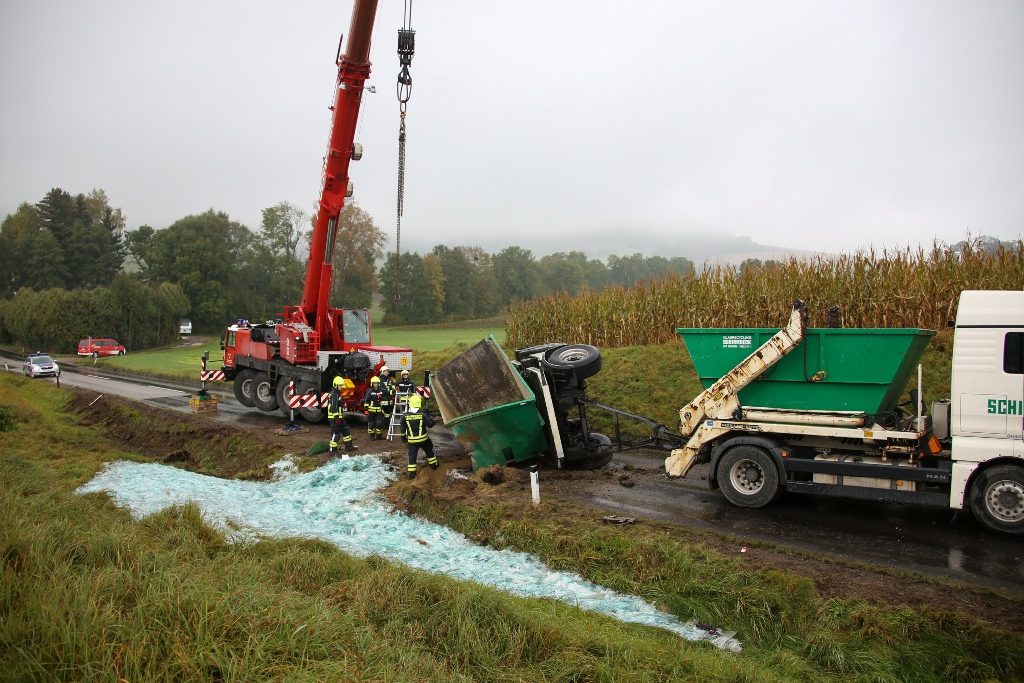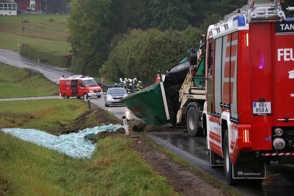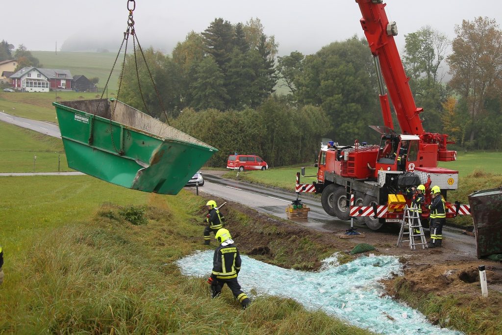 Ein LKW-Anhänger mit Recyclingglas ist Dienstagvormittag auf der Tanzbodenstraße in Ottnang am Hausruck umgestürzt. Der Anhänger mit einem Container voll mit alten Glasscheiben stürzte um, die Glasscherben landeten im Straßengraben und in einer angrenzenden Wiese. Der LKW-Lenker blieb bei dem Unfall unverletzt.