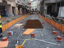 In der Kammerhofgasse wurde ein weiterer Teil der Grundplatte fertiggestelt, die Matten für den Erschütterungsschutz wurden eingebaut und es erfolgte sogar schon eine Gleislieferung.