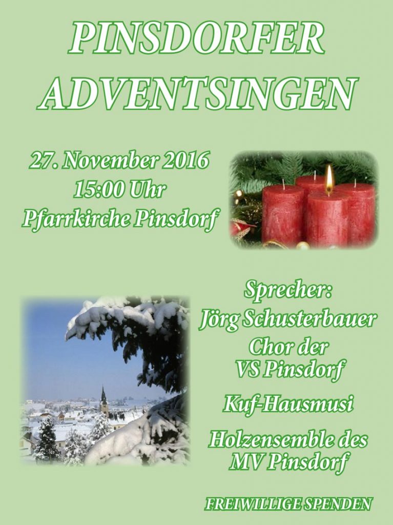 Die Aussteller bieten wieder allerlei Köstlichkeiten und handgemachte Kunstwerke. Umrahmt wird an beiden Tagen der Markt von einer Bläsergruppe des MV Pinsdorf. Unter anderem findet auch am Sonntag um 15:00 Uhr das Pinsdorfer Adventsingen in der Pfarrkirche statt. Hier musizieren der Chor der Volksschule Pinsdorf, das Holzensemble des MV Pinsdorf und die Kuf- Hausmusi. Durch das Programm führt Kons. Jörg Schusterbauer. Auf Ihr Kommen freut sich die Gemeinde Pinsdorf.