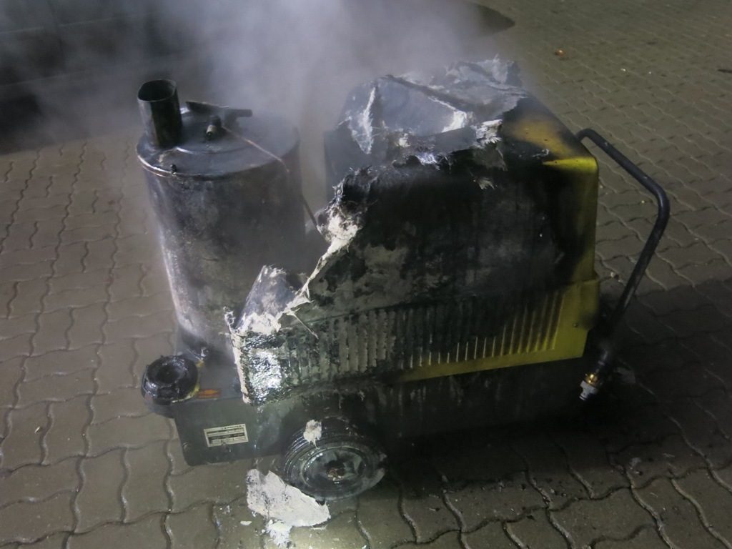 Bei der Lageerkundung konnte der Einsatzleiter gemeinsam mit den Bewohnern des Hofes einen brennenden Dampf-Hochdruckreiniger lokalisieren. Der Brand selbst wurde rasch bekämpft. Eine Kontrolle der Werkstätte und des angrenzenden Heubodens mit der Wärmebildkamera verlief negativ.