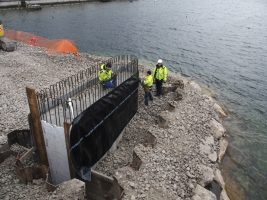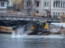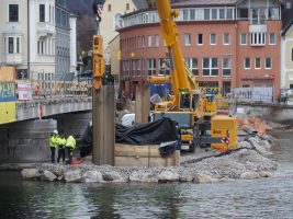 Im Bereich der Brücke wurde weiter an den Pfeilern gearbeitet, die inzwischen bis auf weiteres frostsicher verpackt wurden. Mittlerweile wurden auch die Spundwände wieder entfernt und der Rückbau der Schüttung ist im Gange.