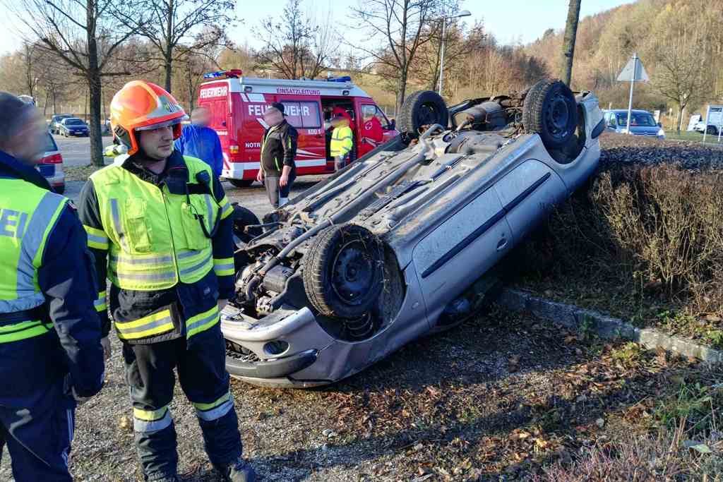 Zwei Fahrzeuge waren im Kreuzungsbereich kollidiert, ein Auto blieb nach einem Überschlag im Bereich des Parkplatzes beim Schulzentrum am Dach liegen. Der Fahrer konnte sich selbst befreien und wurde unbestimmten Grades verletzt. Die Einsatzkräfte der Feuerwehr betreuten den Unfall-Lenker bis zum Eintreffen des Notarztes.