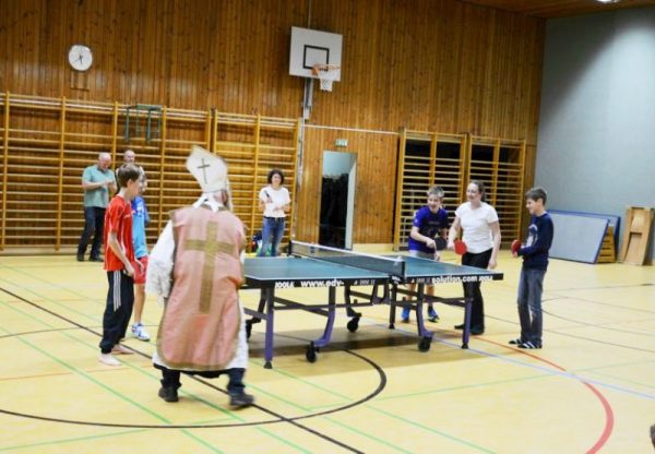 Seine eigene Fitness bewies der Nikolaus beim lustigen Tischtennis-Spiel mit den Jugendlichen. Zum Abschluss belohnte er noch alle anwesenden Turner und Übungsleiter mit seinen Gaben. (Fotos: privat)
