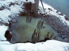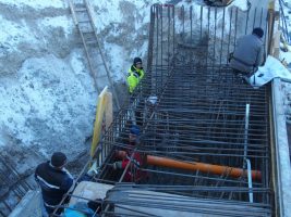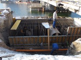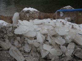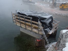 Der Platz für das Widerlager am Ostufer war mit einer dicken Eisschicht versiegelt, die erst mühsam entfernt werden musste, ehe hier weiteres in Angriff genommen werden konnte. Danach gingen die Arbeiten aber in Windeseile voran und der inzwischen errichtete „Käfig“ ist in Wirklichkeit die Schalung und Bewehrung des Widerlagers, das nächste Woche betoniert werden soll, sofern die Temperaturen wie angekündigt endlich wieder steigen.