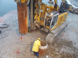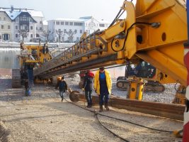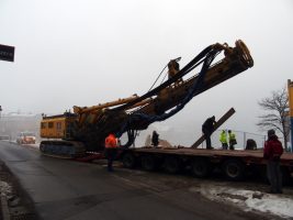 Planmäßig wurde zu Beginn der Woche wieder das beeindruckend große Bohrgerät angeliefert, mit dem die Bohrpfähle für den westlichen Brückenpfeiler und das westliche Widerlager gebohrt werden. Nach dem Aufstellen und Zusammenbauen der Maschine wurde auch gleich losgelegt und die ersten Bohrungen ausgeführt.