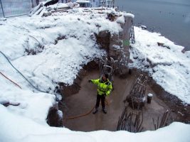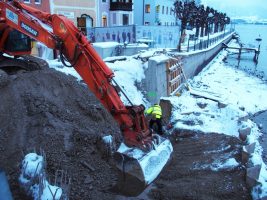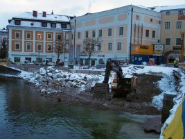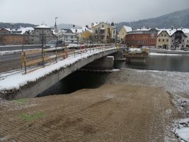 Wie geplant wurden die Arbeiten nach einer kurzen Weihnachtspause trotz Schnee und Kälte am 9. Jänner wieder aufgenommen. Es erfolgten weitere Vorbereitungsarbeiten für das Brückenwiderlager auf der Ostseite und mittlerweile wurde auch die Schüttung auf der Westseite schon errichtet.