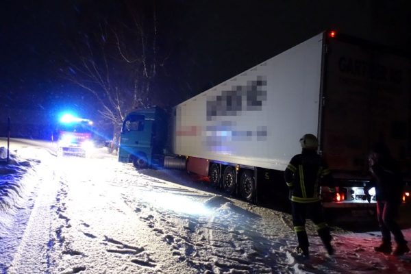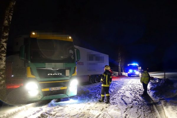 Am 11. Jänner wurde die Feuerwehr Atzbach von einer Atzbacher Firma zur Bergung eines LKW Sattelzugs alarmiert. Der LKW wollte nach der Ladetätigkeit bei der Firma aus dem Firmenareal ausfahren. Aufgrund schneeglatter Fahrbahn kam er auf der leicht abschüssigen Fahrbahn seitlich ins rutschen und blieb mit der Zugmaschine neben der befestigten Fahrbahn stecken. Der Sattelzug drohte dabei „einzuknicken“ und das Führerhaus bei einem Baum zu beschädigen. Die Kameraden zogen das Schwerfahrzeug mit der Seilwinde wieder auf die Straße. Der Fahrer konnte danach ohne Beschädigungen an seinem Fahrzeug die Fahrt fortsetzen.