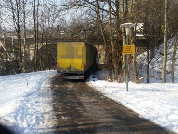 Ein 38-jähriger Kraftfahrer aus Rumänien vertraute am 23. Jänner 2017 um 12:30 Uhr in Vöcklabruck seinem Navigationsgerät, das ihn auf der Schlossstraße Richtung Wagrainer Straße lotste. Bei einer einspurigen Unterführung der B1 stellte er fest, dass er aufgrund der Höhe seines Wagens nicht durchfahren konnte. Er versuchte zurückzuschieben, was ihm aufgrund der Fahrbahnsteigung nicht möglich war. Ein Autofahrer bemerkte dies und verständigte die Polizei. Eine örtliche Sperre und eine Umleitung wurden eingerichtet.