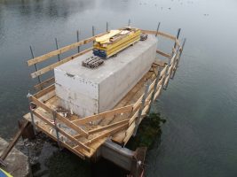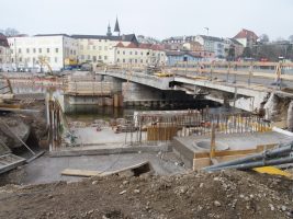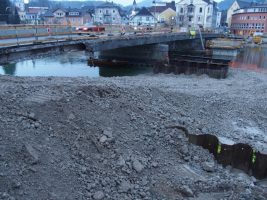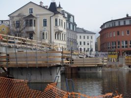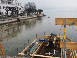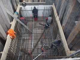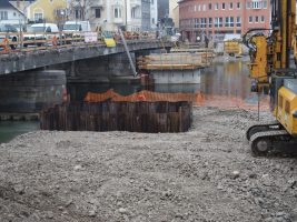 Es geht voran! Ehe man sich’s versah, wurde gleich zu Beginn der Woche rasch und erfolgreich gespundet und sofort mit den Arbeiten am westlichen Pfeiler begonnen. Auch das Widerlager am Ostufer und der dahinterliegende Schacht nahmen immer mehr Gestalt an.