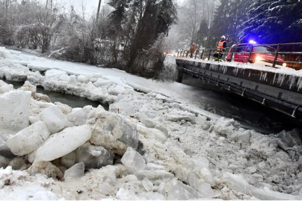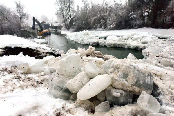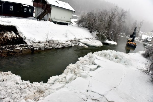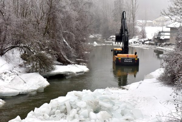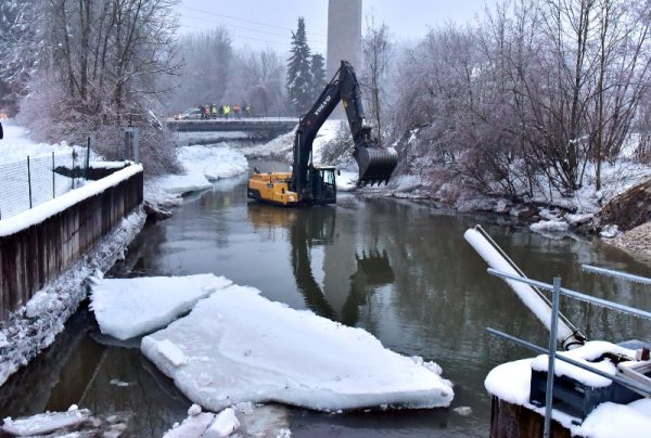 Die Behörden haben heute Vormittag entschieden, den gewaltigen, 600 Meter langen Eisstau auf der Aurach nicht aufzusprengen, sondern aufzubaggern.