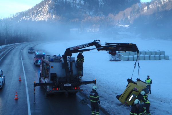 Die Kameraden der Feuerwehr fürhten die PKW-Bergung durch und beseitigten ausgeflossene Betriebsmittel. Die verletzte Insassin wurde vom Roten Kreuz versorgt und ins Krankenhaus gebracht. Im Einsatz standen 59 Mann mit neun Fahrzeugen der Feuerwehren Mitterweissenbach, Bad Ischl und Pfandl sowie das Rote Kreuz und zwei Streifen der Polizei.