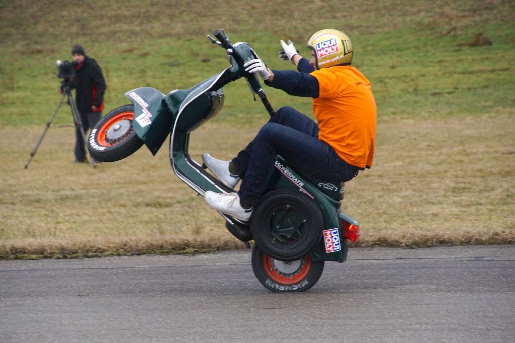 Übrigens vor dem geglückten Weltrekordversuch bewies er allen Anwesenden sein Geschick mit verschiedenen Kunststücken auf seiner Vespa.