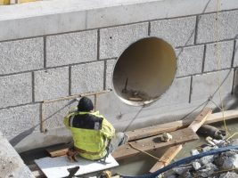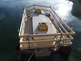 Die Pfeiler wurden inzwischen mit den Brückenlagern bestückt und es wurde fleißig gebaggert um den Rest der Schüttung zu entfernen. Nun kann auch das stadtseitige Widerlager errichtet werden und die Arbeiten dafür laufen bereits.